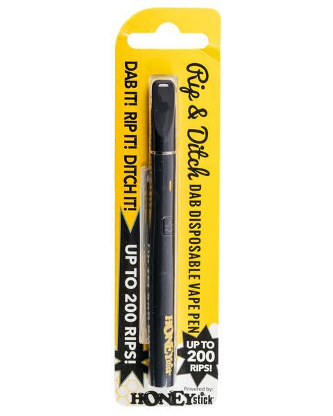 From HoneyStick comes the Rip & Ditch disposable vape pen. Not your average throw-away tank, the Rip & Ditch vape boasts a sleek, sturdy design and unique features. The smooth rubberized exterior of the Rip & Ditch by HoneyStick is magnetized so you can keep the included metal dabber concentrate tool attached and close to the hip. The ergonomic mouthpiece detaches to reveal the fully ceramic chamber with a single rod atomizer for flavor-rich vapor production. The Rip & Ditch vape features a simple single-button control with a light-up cannabis leaf when pressed. Simply click the button five times to unlock, and hold it down to rapidly vaporize your favorite waxy oils. For added safety, the HoneyStick Rip & Ditch comes with a locking feature that’s activated by clicking the button five times after taking a hit. Enjoy up to 200 rips, then ditch.