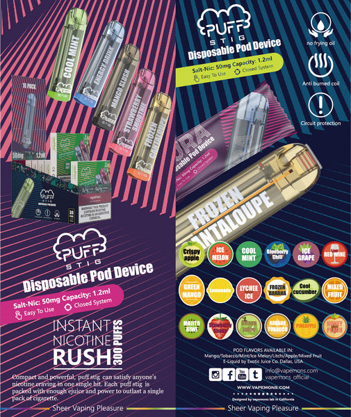 | Puff Stig Disposable Pod Kit utilizes multiple spaces sponge heater for heating, You can choose our various flavors from our selected American ejuice, the high pressured cotton at the mouthpiece can provide better flavor than the ordinary pod. The kit features airflow switch design, just inhale to start vaping. Moreover, the pod adopts a PCTG plastic shell for safer user experience. The puff stig disposable pod Kit has 300mAh Internal battery and supports 350 puffs. Transparent shell has a more cool appearance which helps you know the ejuice condition. |