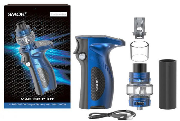 he SMOK MAG Grip 100W TC Starter Kit pays homage to iconic MAG 220W trigger-like designs, presenting a single 18650/20700/21700 platform with intelligent chipset while maintaining a sensational ergonomic elements with visually stunning impression. The SMOK MAG Grip 100W Box Mod takes a tremendous step in crafting a visually impressive chassis, implementing a curved hammer design where the 0.66" OLED display is located. This simultaneously work in conjunction with the the trigger-inspired firing button to craft an ergonomic structure that fits comfortably on the palms for daily vaping usage. The MAG Grip is powered by a single 20700 or 21700 high-amp battery (sold separately), with the option of utilizing single 18650 for additional versatility. Powered by SMOK's newest intelligent chipset for compact devices, the MAG Grip Mod can power up to 100W of maximum power with 20700/21700 battery and a wide range of dynamic output adjustments. The sophistication of the MAG Grip 100W Kit continues with the TFV8 Baby V2 Sub-Ohm Tank, featuring a 5mL maximum eJuice capacity, signature rotary top-fill, massive dual bottom airslots, and the dynamic TFV8 V2 Coil System.